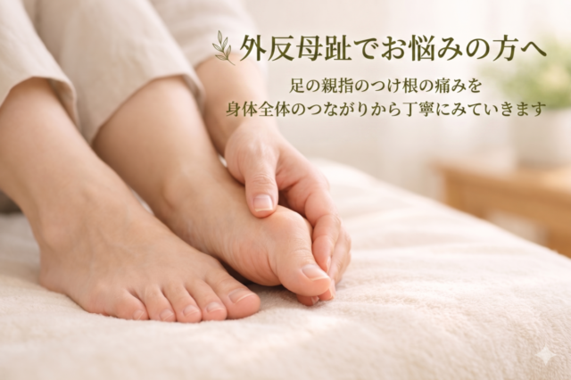 外反母趾では、症状のある親指の付け根だけに強い刺激を入れたり、無理に動かしたりすることが、かえって負担になる場合もあります。当院では、まず今どのような状態にあるのかを確認しながら、無理のない穏やかな手技で整えていきます。