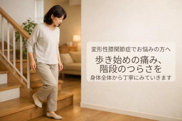 変形性膝関節症は、一般的には膝関節の軟骨や関節まわりに少しずつ負担が重なり、痛み、こわばり、動かしにくさ、歩きづらさなどがあらわれる状態です。症状の出方は人によって異なり、歩き始めの痛みとして感じる方もいれば、階段のつらさ、膝の内側の痛み、立ち上がり時の負担感、正座のしにくさとして感じる方もいます。